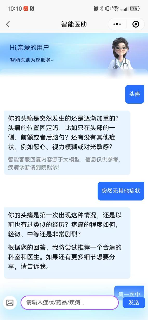 “智能客服”正式上线。我院将紧跟聪慧医疗成长的程序,此功能为患者供给了一个“大夫小帮理”,如春秋、症状等,为患者生成全面且适配的健康干涉策略!
